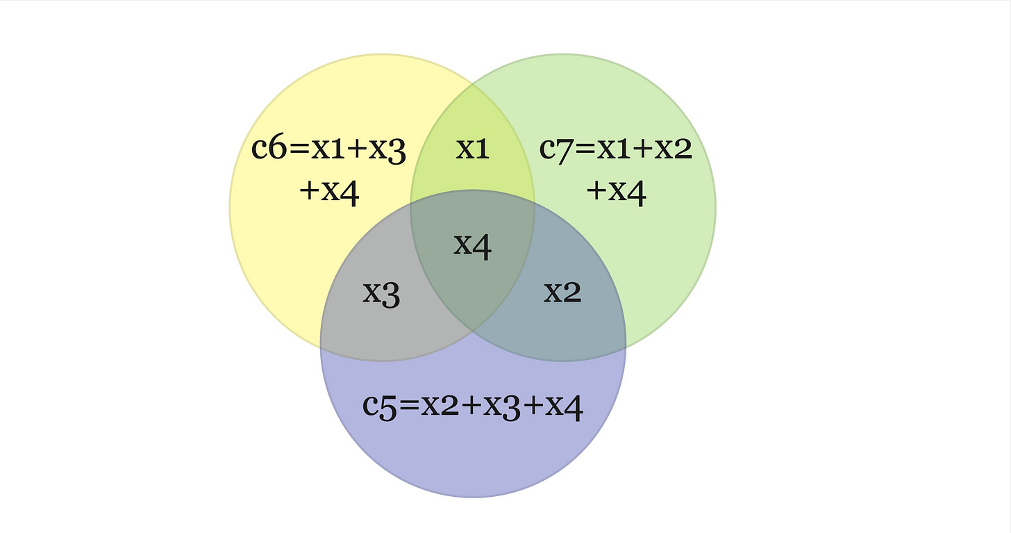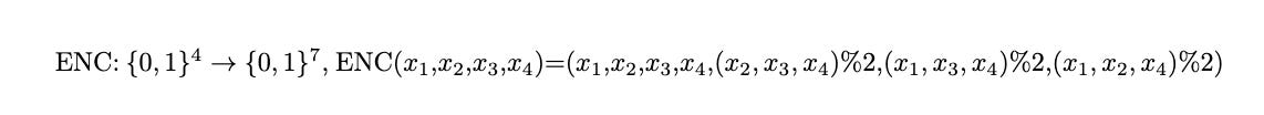Then C is a binary code of blocklength 7. There is a nice way to visualise the bove encoding using 3 circles. Our message bits will be at the intersection of any 2 circles and all the other 3 parity bits ((x2,x3,x4)%2, etc) correspond to the remaining empty cells. You can also notice that each circle sums up to 0mod2.