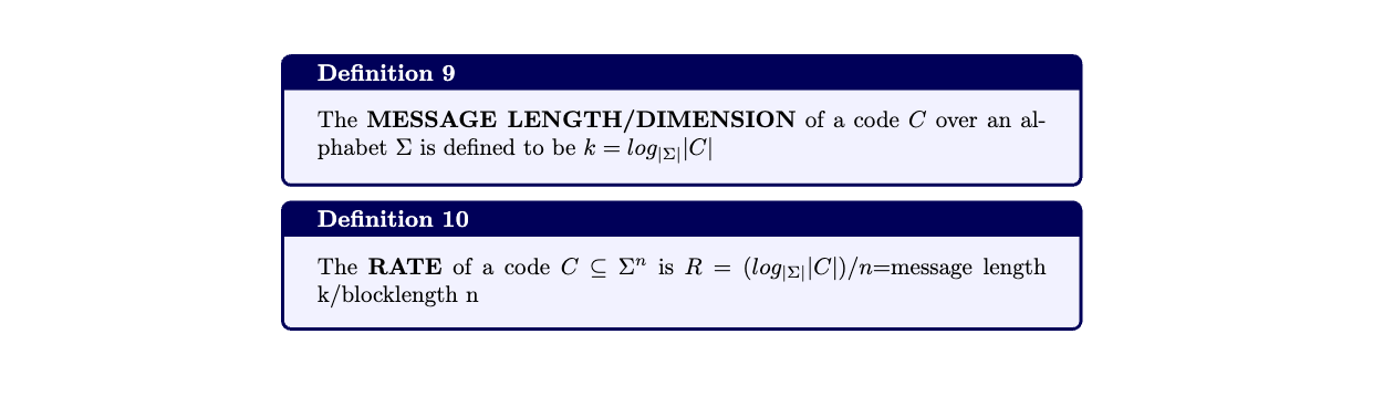 definitions - hamming distance, ball, volume, code dimension, rate, weight and hamming bound