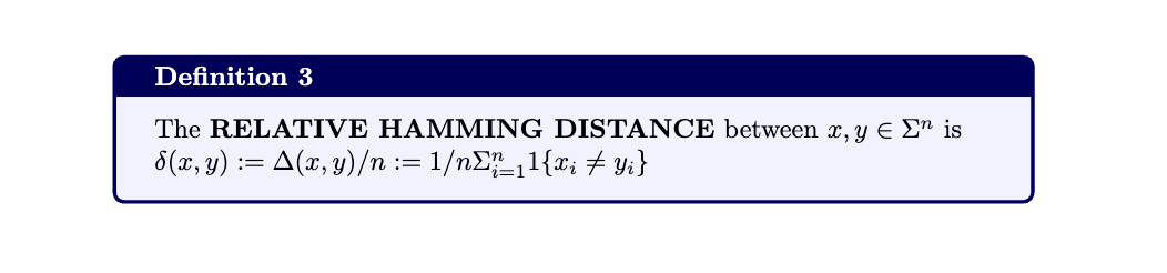 The Relative Hamming Distance and the Minimum Distance are defined as:
