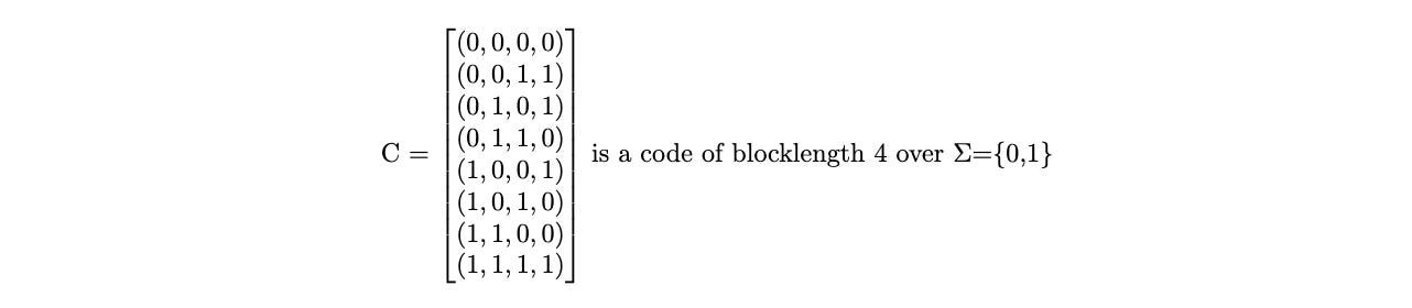 Example 1 An example would be the following where C is a matrix of vectors of length 4 over an alphabet {0,1}. C is a code which has 8 codewords, each of length 4 and all digits are either 0 or 1. Such codes are called binary codes.