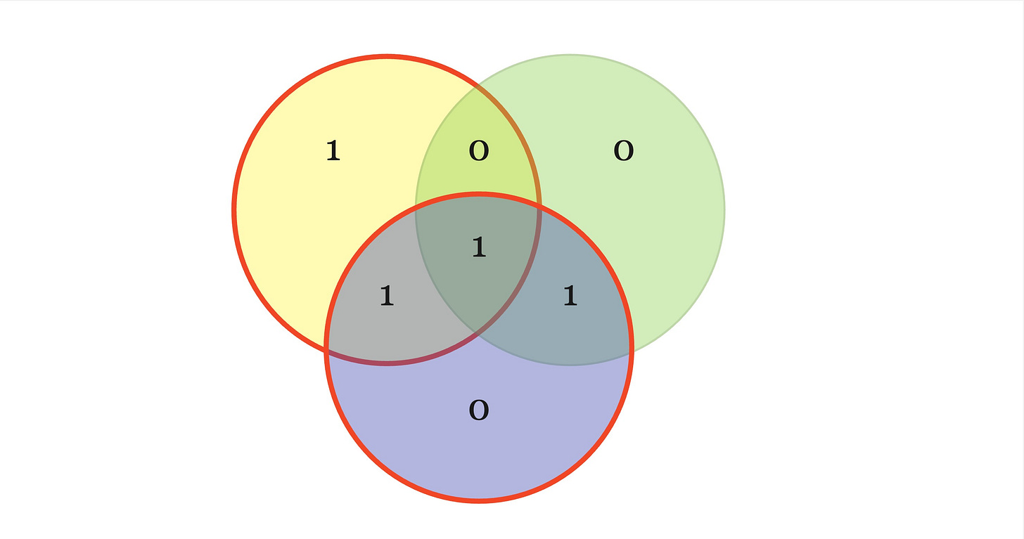 We know that the sum of the bits in each circle should sum up to 0mod%2 but the yellow and blue one don’t, which means the bit at their intersection (aka the 3rd bit) has been corrupted. So now we know the corrected codeword is c={0101010}