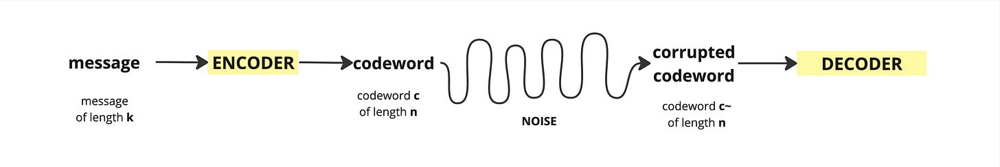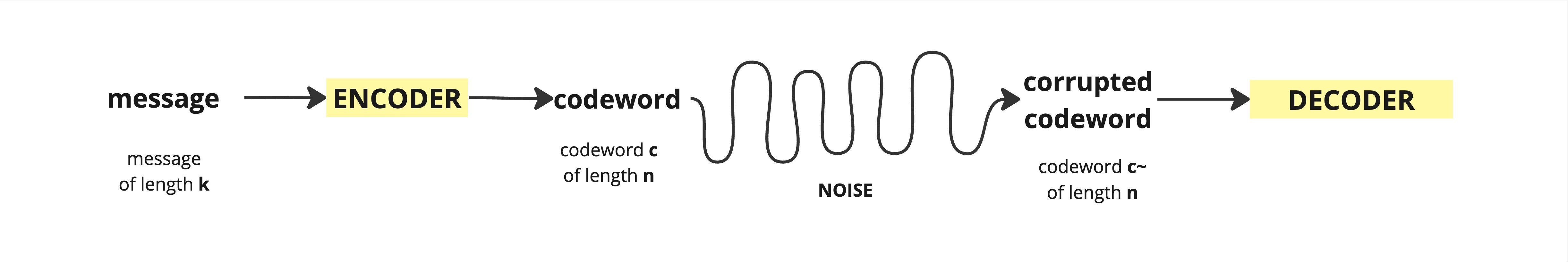 message m of length k → (encoding) codeword c → (channel) received word c’ → (decoding) message m’ of length nLet’s say we have a message m of length k which we are going to encode (somehow) and get a word c of length n. Here n > k as we are adding redundancy data to our original message. We transmit the encoded word c through some communication channel but some of the bits get corrupted and so we receive a corrupted codeword c~ of length n.