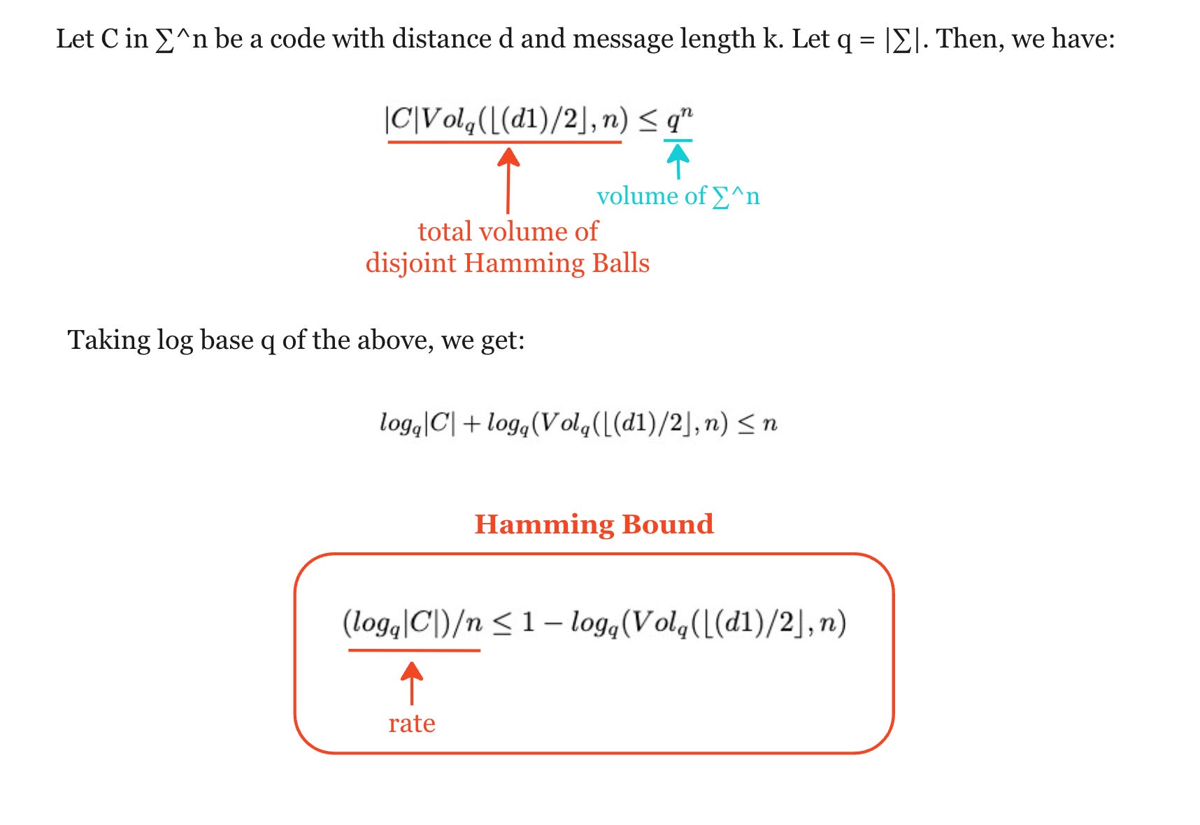 The Hamming Bound gives us a bound in terms of the distance and rate and is important in coding theory as it places an upper limit on the number of distinct codewords that can be encoded using a block of symbols of particular length, to provide a specified error-correcting capability.