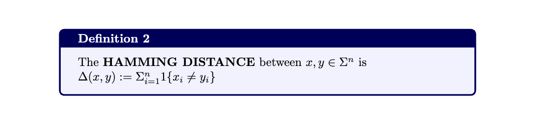 Let’s continue with some more formal definitions. The Hamming Distance between two strings is the number of positions in which they differ.