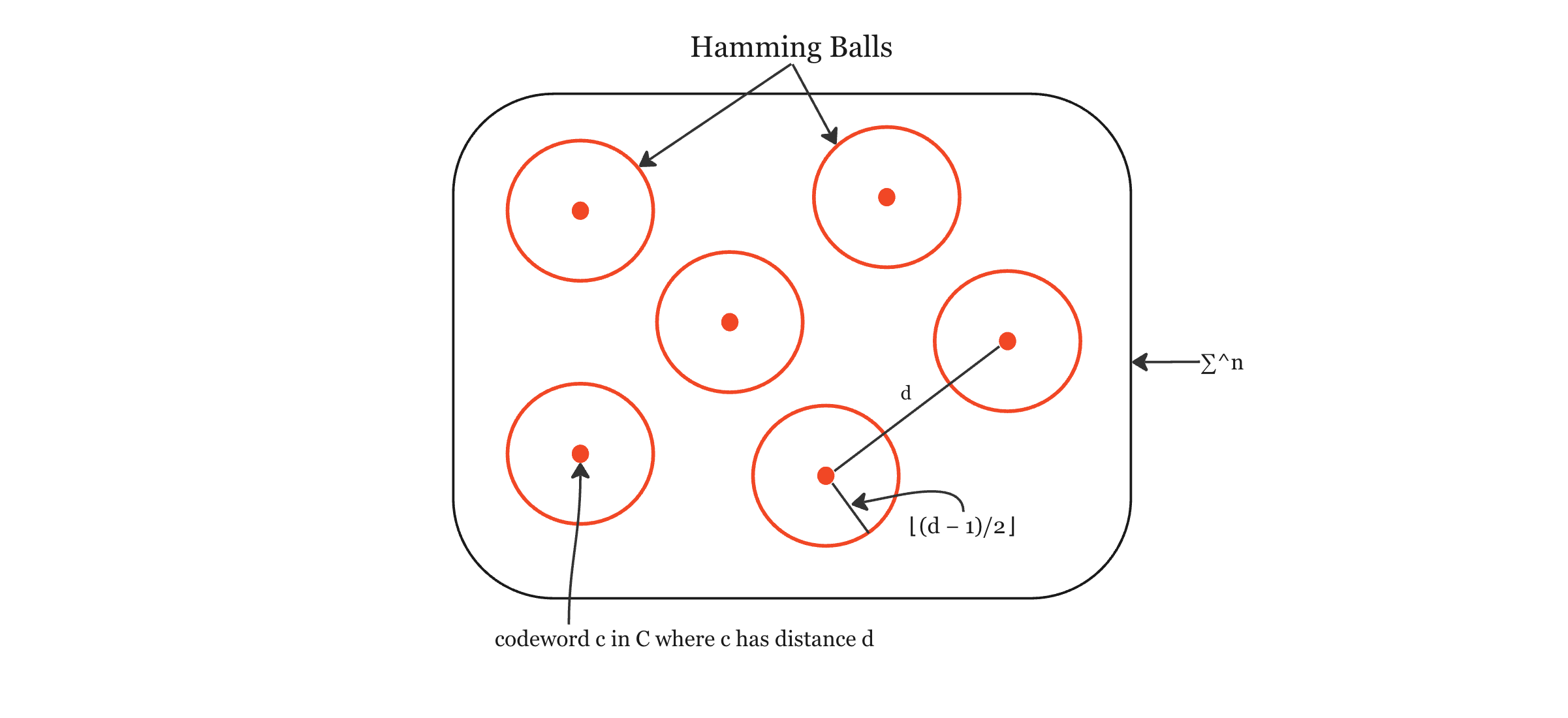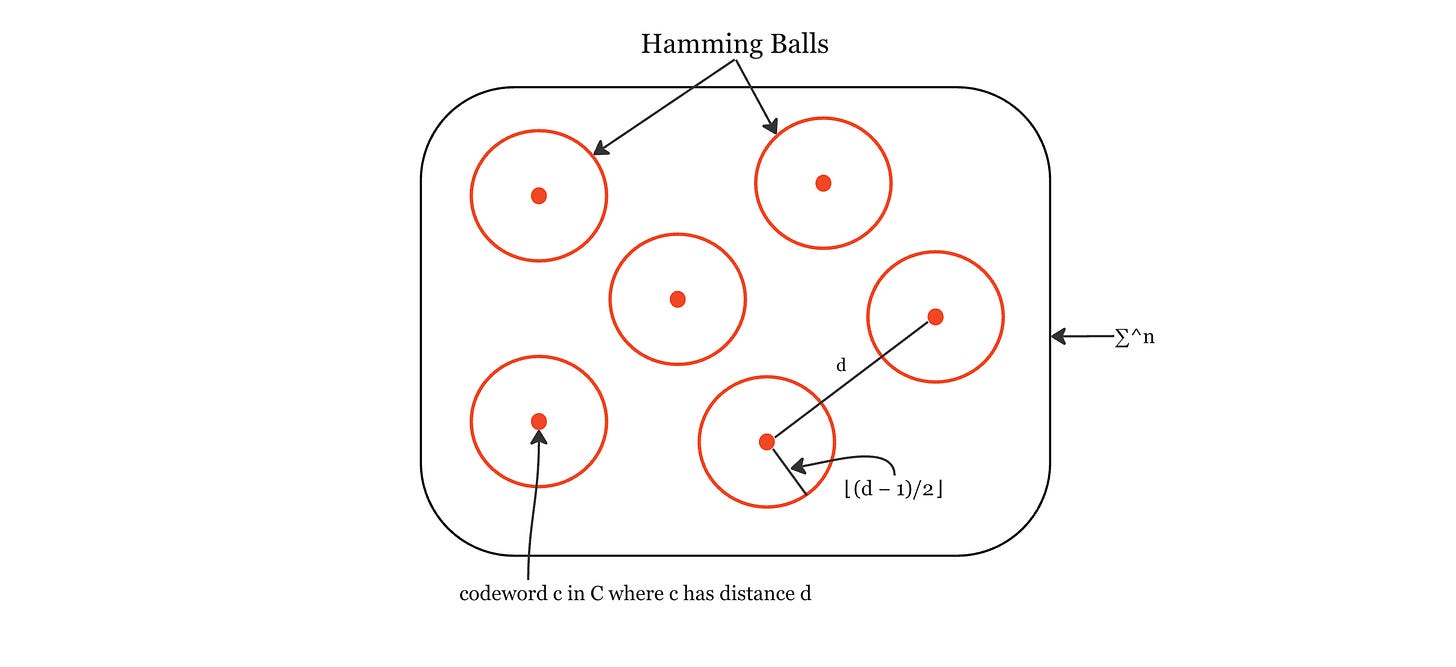 Let’s try and visualise this. Let’s say we have our alphabet ∑ with codewords c in code C, where C has distance d. All of the codewords neighborhoods are non-overlapping since each ball has radius ⌊(d − 1)/2⌋ and the distance between any 2 codewords is d.